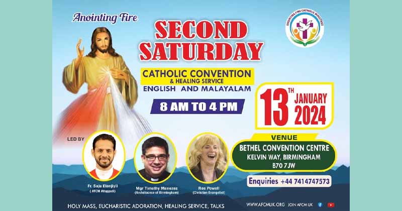 പുതുവർഷത്തിലെ ആദ്യ അഭിഷേകാഗ്നി രണ്ടാം ശനിയാഴ്ച്ച കൺവെൻഷൻ ജനുവരി13ന് ബർമിങ്ഹാം ബെഥേൽ സെന്റെറിൽ നടക്കും . അട്ടപ്പാടി സെഹിയോൻ ധ്യാനകേന്ദ്രത്തിലെ പ്രശസ്ത വചന പ്രഘോഷകൻ ഫാ.സാജു ഇലഞ്ഞിയിൽ കൺവെൻഷൻ നയിക്കു. ബർമിങ്ഹാം അതിരൂപതയിലെ മോൺ. തിമൊത്തി മെനെസിസ്, പ്രമുഖ സുവിശേഷ പ്രവർത്തക റോസ് പവൽ എന്നിവരും കൺവെൻഷനിൽ പങ്കെടുക്കും.