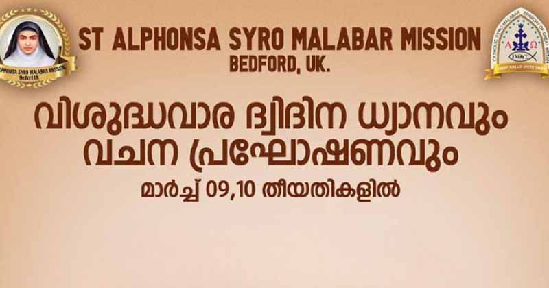 ഗ്രെയ്റ്റ് ബ്രിട്ടൻ സീറോ മലബാർ രൂപതയിൽ അടുത്തയിടെ മിഷനായി ഉയർത്തപ്പെട്ട ബെഡ്ഫോർഡ് സെന്റ് അൽഫോൻസാ സീറോ മലബാർ മിഷനിൽ സംഘടിപ്പിക്കുന്ന വിശുദ്ധവാര ദ്വിദിന ധ്യാനത്തിലും, തിരുവചന ശുശ്രുഷയിലും പങ്കു ചേർന്ന് ക്രിസ്തുവിന്റെ പീഡാ-സഹന പാഥയിലൂടെ ചേർന്ന് നടക്കുവാനും, ഉദ്ധിതനായ ക്രിസ്തുവിന്റെ കൃപകളും, കരുണയും, അനുഗ്രഹങ്ങളും പ്രാപിക്കുവാനും ഏറെ അനുഗ്രഹദായമാവും ശുശ്രുഷകൾ.