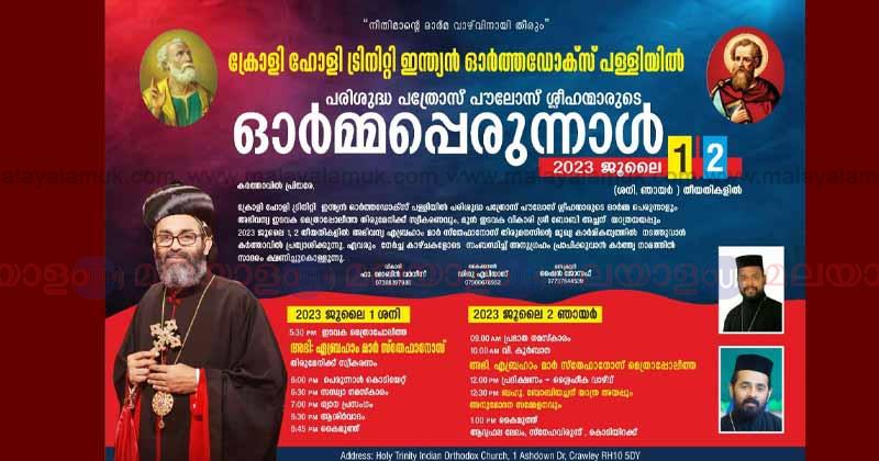 ക്രോളി: വെസ്റ്റ് സസ്സെക്സിലെ മലങ്കര സഭയുടെ ഏക ദേവാലയമായ ക്രോളി ഹോളി ട്രിനിറ്റി ഇന്ത്യൻ ഓർത്തഡോക്സ് പള്ളിയിൽ പരിശുദ്ധ പത്രോസ് പൗലോസ് ശ്ലീഹന്മാരുടെ ഓർമ്മ പെരുന്നാളും അഭിവന്ദ്യ ഇടവക മെത്രാപ്പോലീത്ത തിരുമേനിക്ക് സ്വീകരണവും, ഇടവകയുടെ മുൻ വികാരി ബഹുമാനപെട്ട ബോബി അച്ചന് യാത്രയയപ്പും 2023 ജൂലൈ 1, 2 തീയതികളിൽ നടത്തപ്പെടുന്നു.