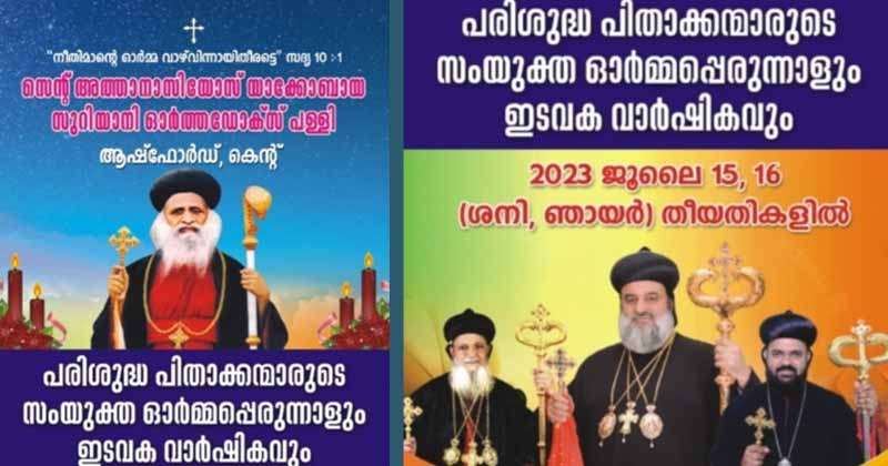 കെന്റിലെ ആഷ്ഫോർഡ് ആസ്ഥാനമായി പ്രവർത്തിക്കുന്ന സെന്റ് അത്താനാസിയോസ് യാക്കോബായ സുറിയാനി ഓർത്തഡോൿസ് പള്ളിയുടെ വാർഷിക പെരുന്നാളും വിശുദ്ധ പത്രോസ് പൗലോസ് ശ്ലീഹന്മാരുടെയും പരിശുദ്ധ തോമാ സ്ലീഹായുടെയും, മോർ കുര്യാക്കോസ് സഹദായുടെയും അദ്ദേഹത്തിന്റെ മാതാവായ മോർത് യൂലീത്തിയുടെയും സംയുക്ത ഓർമ്മ പെരുന്നാളും ഭക്തി നിർഭരമായ ചടങ്ങുകളോടെ 2023 ജൂലൈ മാസം 15,16 ശനി,ഞായർ തീയതികളിൽ നടത്തപ്പെടും.