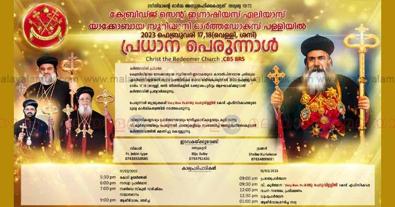 കേംബ്രിഡ്ജിലെ യാക്കോബായ സുറിയാനി ഇടവകയുടെ കാവൽ പിതാവായ പരിശുദ്ധ ഏലിയാസ് തൃതീയൻ ബാവയുടെ ( മഞ്ഞനിക്കര ബാവ) ഓർമ്മപ്പെരുന്നാൾ 2023 ഫെബ്രുവരി 17,18 ( വെള്ളി, ശനി) തീയതികളിൽ ഭക്ത്യാദരപൂർവ്വം ആഘോഷിക്കുന്നു. പെരുന്നാൾ ശുശ്രൂഷകൾ വെരി. റവ ഫാ. രാജു ചെറുവിളളിൽ കോർ എപ്പിസ്കോപ്പയുടെ മുഖ്യകാർമികത്വത്തിൽ നടത്തപ്പെടുന്നു. വിശുദ്ധ കുർബാനയിലും പെരുന്നാൾ ചടങ്ങുകളിലും സംബന്ധിച്ച് അനുഗ്രഹീതരാകുവാൻ ഏവരെയും കർതൃനാമത്തിൽ എല്ലാവരെയും
