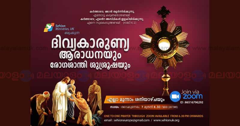 സെഹിയോൻ യുകെ മിനിസ്ട്രിയുടെ നേതൃത്വത്തിൽ എല്ലാ മൂന്നാം ശനിയാഴ്ച്ചയും നടക്കുന്ന ദിവ്യകാരുണ്യ ആരാധനയും രോഗശാന്തി ശുശ്രൂഷയും 17 ന് നാളെ നടക്കും.