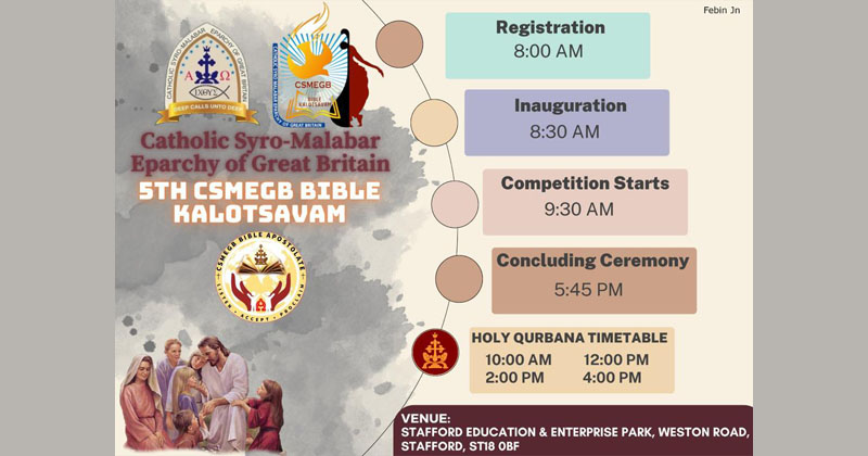 ഗ്രേറ്റ് ബ്രിട്ടൻ സീറോ മലബാർ രൂപത ബൈബിൾ കലോത്സവം ഇന്ന് സ്റ്റാഫ്ഫോഡിൽ നടക്കും . രണ്ട് വർഷത്തെ നീണ്ട ഇടവേളക്ക് ശേഷം കലോത്സവം വീണ്ടും വേദികൾ കീഴടക്കുമ്പോൾ മത്സരാർത്ഥികളും വിശ്വാസസംമൂഹവും ഏറെ ആവേശത്തിലാണ്. മത്സരത്തിന്റെ എല്ലാ ഒരുക്കങ്ങളും പൂർത്തിയായതായി ബൈബിൾ കലോത്സവത്തിന് നേതൃത്വം കൊടുക്കുന്ന രൂപത ബൈബിൾ അപ്പോസ്റ്റലേറ്റ് ടീം അറിയിച്ചു . . രാവിലെ എട്ടു മണിക്ക് രജിസ്ട്രേഷൻ ആരംഭിക്കും . എട്ടരമുതൽ ഉദ്ഘാടന പരിപാടികൾ ആരംഭിക്കും . ആഘോഷമായ ബൈബിൾ പ്രതിഷ്ഠയോടെ ആരംഭിക്കുന്ന മത്സരങ്ങൾ മാർ ജോസഫ് സ്രാമ്പിക്കൽ ഉദ്ഘാടനം നിർവഹിക്കും . കൃത്യം ഒമ്പത് മുപ്പതുമുതൽ വിവിധ സ്റ്റേജുകളിലായി മത്സരങ്ങൾ ആരംഭിക്കും.
