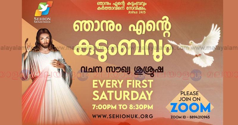 കുടുംബ പ്രേഷിതദൗത്യ നിർവ്വഹണത്തിലൂടെ “കുടുംബം ഒരു ദേവാലയം ” എന്ന അതുല്യമായ അനുഭവം ദൈവപരിപാലനയിൽ കണ്ടെത്തുന്ന , കുടുംബത്തിനും കുടുംബബന്ധങ്ങൾക്കും പൈശാചിക ബന്ധനങ്ങളിൽനിന്നും വിടുതൽ നൽകുന്ന തിരുവചന സൗഖ്യ ശുശ്രൂഷ എല്ലാ ആദ്യ ശനിയാഴ്ച്ചകളിലും സെഹിയോൻ യുകെ യുടെ നേതൃത്വത്തിൽ നടക്കുന്നു.