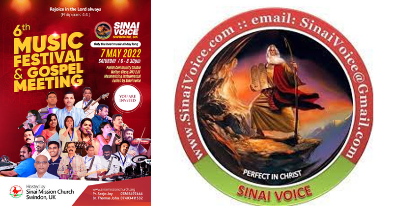 സ്വിണ്ടൻ: സിനായ് മിഷൻ ചർച്ചിന്റെ ആഭിമുഖ്യത്തിൽ സിനായ് വോയ്സിന്റെ മ്യൂസിക് നൈറ്റും,സുവിശേഷയോഗവും 2022 മെയ് ഏഴാം തീയതി ശനിയാഴ്ച്ച (5.30 – 8.30) സ്വിണ്ടനിൽ നടത്തപ്പെടുന്നു.യു. കെ.യുടെ വിവിധ സ്ഥലങ്ങളിൽ നിന്നുള്ള ഗായികാ ഗായകന്മാർ പങ്കെടുക്കുന്നതാണ്. കഴിഞ്ഞ അഞ്ചു വർഷങ്ങളിൽ നിന്നും തികച്ചും വ്യത്യസ്തമായി ഒത്തിരി പുതുമകളോടുകൂടെയാണ് ഈ വർഷത്തെ ഗാനസന്ധ്യ ഒരുക്കിയിരിക്കുന്നത്.