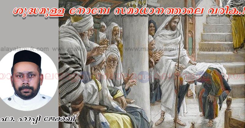 അവൾക്ക് സൗഖ്യം ലഭിച്ചപ്പോൾ ചുറ്റും കൂടിനിന്നവർ അവൾക്ക് എതിരെ തിരിയുന്നു. സൗഖ്യം ലഭിച്ച സമയവും സാഹചര്യവും എല്ലാം അവർ കുറ്റാരോപണത്തിനായി എടുത്ത് ഉപയോഗിക്കുന്നു. എന്നാൽ ചില പഴയ നിയമ വാക്യങ്ങൾ ഉച്ചരിച്ച് കർത്താവ് അവർക്ക് മറുപടി കൊടുക്കുന്നു . ക്രിസ്ത്യാനികൾ പലപ്പോഴും ക്രൈസ്തവ ക്രൈസ്തവത്തിനെതിരായി ജീവിക്കുകയും പ്രവർത്തിക്കുകയും ചെയ്യുന്നില്ലേ. പല തട്ടമുട്ടികളും പറഞ്ഞ് അനേകർക്ക് ലഭിക്കേണ്ട സൗഖ്യവും ക്യപയും നാം തട്ടിമാറ്റുന്നില്ലേ . എന്താണ് നമ്മുടെ ധർമ്മം . എല്ലാവരും ക്രിസ്തുവിനെപ്പോലെ ആയി തീർന്ന് അനേകർക്ക് പ്രകാശമാകേണ്ടവരും ദൈവകൃപ ആസ്വദിക്കേണ്ടവരുമാണ്. നമ്മുടെ കർത്താവ് അരുളിയത് പോലെ എന്നെ കണ്ടവൻ എന്റെ പിതാവിനെ കണ്ടിരിക്കുന്നു. നമ്മെ കാണുന്നവർ നമ്മളിലൂടെ കർത്താവിനെ കാണുമ്പോൾ മാത്രമേ ക്രൈസ്തവജീവിതം പരി പൂർണമാവുകയുള്ളൂ. ഈ നോമ്പും നമ്മെ പഠിപ്പിക്കുന്നു . സ്വയത്തിലുള്ള പ്രശംസയും ആശ്രയവും മതിയാക്കി അനേകരെ നേടുവാൻ തക്കവണ്ണം മാറ്റപ്പെടുക. പരിശുദ്ധവും ശ്രേഷ്ഠവുമായ നോമ്പേ സമാധാനത്താലെ വരിക.