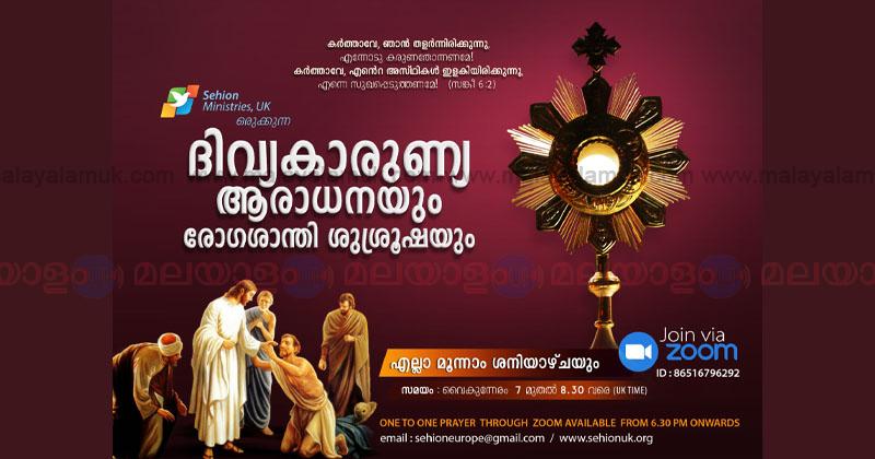 സെഹിയോൻ യുകെ മിനിസ്ട്രിയുടെ നേതൃത്വത്തിൽ എല്ലാ മൂന്നാം ശനിയാഴ്ച്ചയും നടക്കുന്ന ദിവ്യകാരുണ്യ ആരാധനയും രോഗശാന്തി ശുശ്രൂഷയും 19 ന് നാളെ നടക്കും.