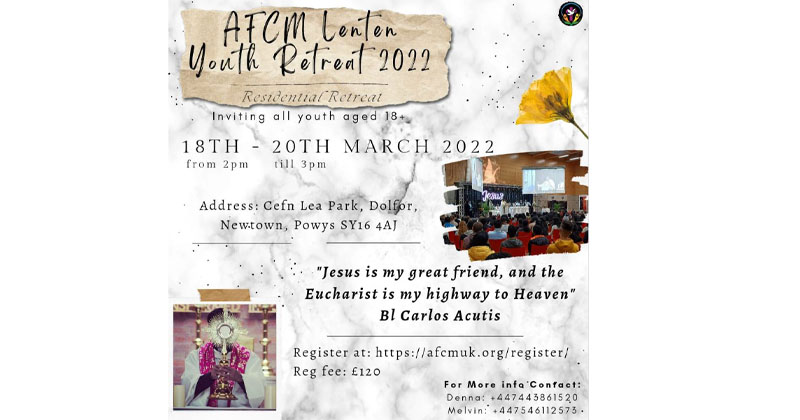 afcmuk.org/register എന്ന ലിങ്കിൽ രജിസ്റ്റർ ചെയ്യാവുന്നതാണ് . വലിയ നോമ്പിന്റെ ഒരുക്കമായി നടത്തപ്പെടുന്ന ഈ അനുഗ്രഹീത ശുശ്രൂഷയിലേക്ക് അഭിഷേകാഗ്നി കാത്തലിക് മിനിസ്ട്രി യേശുനാമത്തിൽ എല്ലാ യുവതീയുവാക്കളെയും ക്ഷണിക്കുന്നു.