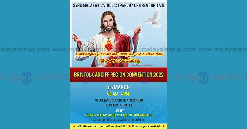 സീറോ മലബാര് എപ്പാര്ക്കി ഓഫ് ഗ്രേറ്റ് ബ്രിട്ടന്റെ ബ്രിസ്റ്റോള് കാര്ഡിഫ് റിജിയന് കണ്വെന്ഷന് മാര്ച്ച് 5ന് രാവിലെ 9 മണി മുതല് വൈകീട്ട് നാലു മണിവരെ കാര്ഡിഫിലെ സെന്റ് ജൂലിയന്സ് സ്കൂളില് വച്ച് നടത്തുന്നു. ധ്യാനം നയിക്കുന്നത് ഈയിടെ നാട്ടില് നിന്നെത്തിയ ഫാദര് ജോബി വെള്ളപ്ലാക്കല് CST യും സീറോ മലബാര് രൂപതാ ഇവാഞ്ചലൈസേഷന് ചെയര് പേഴ്സണ് സിസ്റ്റര് ആന് മരിയയും ചേര്ന്നാണ്. കുട്ടികള്ക്കായി പ്രത്യേക സെക്ഷനും ഒരുക്കിയിട്ടുണ്ട്. കോവിഡിന് ശേഷം നടക്കുന്ന ആദ്യ ലൈവ് കണ്വെന്ഷനായുള്ള ഒരുക്കങ്ങള് പൂര്ത്തിയാകുകയാണ്.