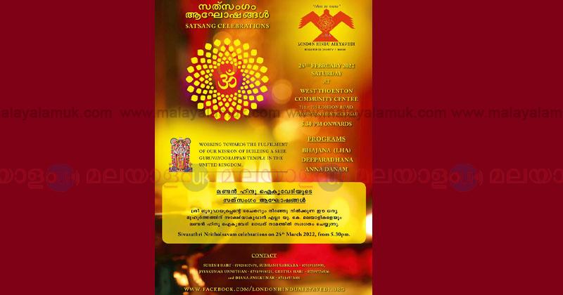 സത്സംഗം ആദ്ധ്യാത്മിക സാധ്യതകൾ സ്വാംശീകരിക്കുന്നതിന് ഏറ്റവും ഉപകരിക്കുന്ന ഒന്നാണ്. ലണ്ടൻ ഹിന്ദു ഐക്യവേദിയുടെ ഈ മാസത്തെ സത്സംഗം ആഘോഷമായി ഫെബ്രുവരി 26-ാം തീയതി ക്രോയിഡോണിലെ വെസ്റ്റ് തോൺടൺ കമ്മ്യൂണിറ്റി സെന്ററിൽ വച്ച് വൈകുന്നേരം 5.30 മുതൽ ആഘോഷിക്കുന്നതായിരിക്കും.