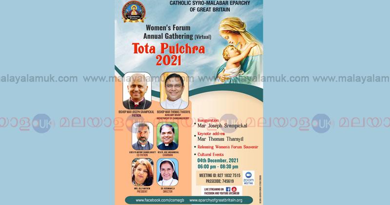 ബിർമിംഗ് ഹാം . ഗ്രേറ്റ് ബ്രിട്ടൻ സീറോ മലബാർ രൂപതാ വിമൻസ് ഫോറത്തിന്റെ മൂന്നാമത് വാർഷിക സമ്മേളനം ഡിസംബർ നാലാം തീയതി ശനിയാഴ്ച വെർച്വൽ ആയി നടക്കും . സർവമനോഹരിയായ പരിശുദ്ധ കന്യാ മറിയത്തെ വിശേഷിപ്പിക്കുന്ന “റ്റോട്ട പുൽക്രാ ” എന്ന പേരിലാണ് വാർഷിക സമ്മേളനം സംഘടിപ്പിച്ചിരിക്കുന്നത് . രൂപതയിലെ മുഴുവൻ ഉള്ള മുഴുവൻ വനിതകളും അംഗങ്ങളായ സംഘടന വിവിധ ഇടവകകളിലും , മിഷനുകളിലും വളരെ കാര്യക്ഷമമായ രീതിയിൽ ഉള്ള പ്രവർത്തനങ്ങളാണ് നടത്തിക്കൊണ്ടിരിക്കുന്നത് .
