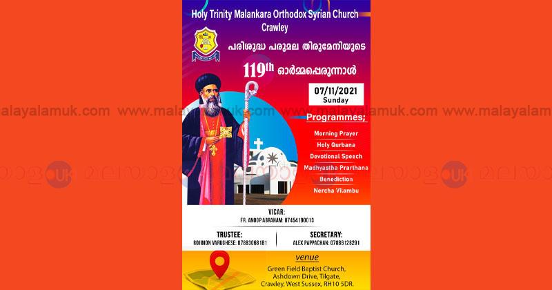 ക്രോളി: മലങ്കര ഓർത്തഡോൿസ് സഭയുടെ പ്രഖ്യാപിത പരിശുദ്ധനായ പരുമല മാർ ഗ്രീഗോറിയോസ് തിരുമേനിയുടെ ഓർമ പെരുന്നാൾ ഹോളി ട്രിനിറ്റി ഇന്ത്യൻ ഓർത്തഡോൿസ് പള്ളിയിൽ നവംബർ 7 ന് ഞായറാഴ്ച രാവിലെ നടത്തപ്പെടുന്നു.