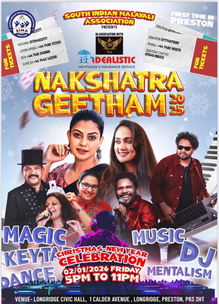 പ്രസ്റ്റൺ: സൗത്ത് ഇന്ത്യൻ മലയാളി അസോസിയേഷൻ (SIMA) യുടെ ആഭിമുഖ്യത്തിൽ 2026 ജനുവരി 2-ന് ‘നക്ഷത്ര ഗീതം 2025’ എന്ന പേരിൽ വിപുലമായ ക്രിസ്മസ് – പുതുവത്സര സാംസ്കാരിക വിരുന്ന് പ്രസ്റ്റണിൽ സംഘടിപ്പിക്കുന്നു. വൈകുന്നേരം 5 മുതൽ രാത്രി 11 വരെയാണ് പരിപാടികൾക്ക് വേദിയൊരുക്കിയിരിക്കുന്നത്.