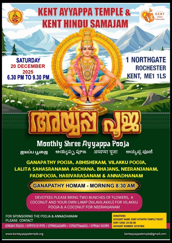 ഇംഗ്ലണ്ടിലെ കെന്റ് അയ്യപ്പ ടെംപിൾ കെന്റ് ഹിന്ദു സമാജത്തിന്റ ധനു മാസ ശ്രീ അയ്യപ്പ പൂജ, (2025 ഡിസംബർ 20 -ാം തീയതി ശനിയാഴ്ച) നടക്കും. രാവിലെ 8:30 ന് ഗണപതി ഹോമം, വൈകുന്നേരം 6:30 മുതൽ അഭിഷേകം, വിളക്ക് പൂജ, ലളിത സഹസ്ര നാമ അർച്ചന, ഭജന, നീരാഞ്ജനം, പടിപൂജ, ഹരിവരാസനം എന്നിവ നടത്തപ്പെടുന്നതാണ്, വിളക്ക് പൂജയിൽ പങ്കെടുക്കുന്ന ഭക്തർ രണ്ടു ബഞ്ച് പൂക്കളും, ഒരു നിലവിളക്കും, നീരാഞ്ചനത്തിന് ഒരു നാളികേരവും കൊണ്ട് വരേണ്ടതാണ്.ക്ഷേത്രം മേൽശാന്തി ശ്രീ അഭിജിത്തും, താഴൂർ മന ശ്രീ ഹരിനാരായണൻ നമ്പിടിശ്വരറും പൂജകൾക്ക് കർമികത്വം വഹിക്കും