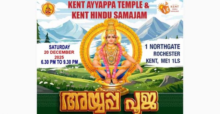 ഇംഗ്ലണ്ടിലെ കെന്റ് അയ്യപ്പ ടെംപിൾ കെന്റ് ഹിന്ദു സമാജത്തിന്റ ധനു മാസ ശ്രീ അയ്യപ്പ പൂജ, (2025 ഡിസംബർ 20 -ാം തീയതി ശനിയാഴ്ച) നടക്കും. രാവിലെ 8:30 ന് ഗണപതി ഹോമം, വൈകുന്നേരം 6:30 മുതൽ അഭിഷേകം, വിളക്ക് പൂജ, ലളിത സഹസ്ര നാമ അർച്ചന, ഭജന, നീരാഞ്ജനം, പടിപൂജ, ഹരിവരാസനം എന്നിവ നടത്തപ്പെടുന്നതാണ്, വിളക്ക് പൂജയിൽ പങ്കെടുക്കുന്ന ഭക്തർ രണ്ടു ബഞ്ച് പൂക്കളും, ഒരു നിലവിളക്കും, നീരാഞ്ചനത്തിന് ഒരു നാളികേരവും കൊണ്ട് വരേണ്ടതാണ്.ക്ഷേത്രം മേൽശാന്തി ശ്രീ അഭിജിത്തും, താഴൂർ മന ശ്രീ ഹരിനാരായണൻ നമ്പിടിശ്വരറും പൂജകൾക്ക് കർമികത്വം വഹിക്കും