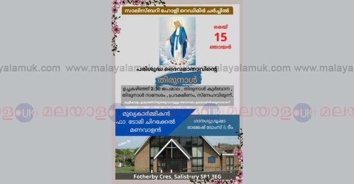 സാലിസ്ബറി : പരിശുദ്ധ ദൈവമാതാവിന്റെ തിരുനാൾ ഭക്തിപൂർവ്വം സാലിസ്ബറിയിൽ ആചരിച്ചു . മെയ് മാസം 15 ന് സാലിസ്ബറിയിലെ ഹോളി റെഡിമിർ കാത്തോലിക് പള്ളിയിൽ വച്ച് നടത്തപ്പെട്ട തിരുന്നാൾ കർമ്മങ്ങളിൽ സാലിസ്ബറിയിലും പരിസരപ്രദേശങ്ങളുമുള്ള നാനാ ജാതി മതസ്ഥർ പങ്കെടുത്ത് അനുഗ്രഹം പ്രാപിച്ചു . ബഹുമാനപ്പെട്ട വികാരിയച്ചൻ റ്റോമി ചിറയ്ക്കൽ മണവാളൻ അച്ചൻ തിരുനാൾ കുർബാനയർപ്പിച്ച് തിരുനാൾ സന്ദേശം നൽകി . രാജേഷ് ടോംസിന്റെയും ജ്യോതി മെൽവിന്റെയും നേതൃത്വത്തിൽ ആലപിച്ച ഗാനങ്ങൾ തിരുന്നാളിനെ കൂടുതൽ ഭക്തിസാന്ദ്രമാക്കി .
