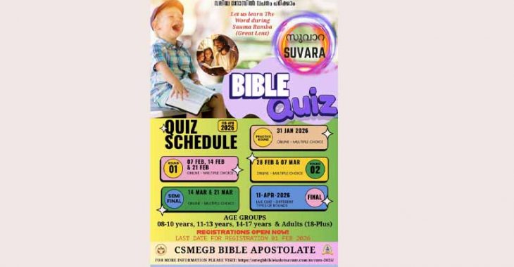 ബിർമിങ്ഹാം .ഗ്രേറ്റ് ബ്രിട്ടൻസീറോ മലബാർ രൂപത നടത്തുന്ന ആറാമത് സുവാറ ഓൺലൈൻ ബൈബിൾ ക്വിസ് മത്സരങ്ങളുടെ രജിസ്ട്രേഷൻ ഫെബ്രുവരി1ന് അവസാനിക്കും. മത്സര നടത്തിപ്പിനെക്കുറിച്ച് കൂടുതലായി മനസിലാക്കുന്നതിനായി നടത്തുന്ന പ്രാക്ടീസ് മത്സരങ്ങൾ ജനുവരി 31ന് നടത്തപ്പെടും. നാളെ നടക്കുന്ന പ്രാക്ടീസ് ടെസ്റ്റിനുള്ള ലിങ്കും സമയക്രമവും മത്സരാർത്ഥികളുടെ റെജിസ്റ്റേർഡ് ഈമെയിലിൽ നാളെ രാവിലെ ലഭിക്കും. മത്സരങ്ങൾക്കുള്ള ലിങ്ക് നാളെ ലഭിച്ചില്ലായെങ്കിൽ നിങ്ങളുടെ മിഷനിലുള്ള ബൈബിൾ അപ്പസ്റ്റോലറ്റ് കോർഡിനേറ്ററുമായി ബന്ധപ്പെടേണ്ടതാണ്.ആദ്യറൗണ്ട് മത്സരങ്ങൾ ഫെബ്രുവരി 7ന് ആണ് ആരംഭിക്കുന്നത് . മൂന്ന് റൗണ്ടുകളിലായി നടത്തപ്പെടുന്ന മത്സരങ്ങളുടെ ഫൈനൽ മത്സരങ്ങൾ ഏപ്രിൽ 11ന് നടത്തപ്പെടും.