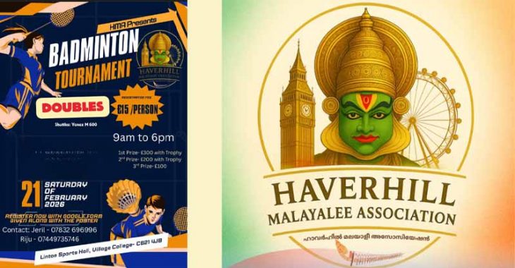 ഈസ്റ്റ് ആംഗ്ലിയയിലെ മലയാളി സമൂഹത്തിന്റെ സാമൂഹികവും സാംസ്കാരികവുമായ വളർച്ചയ്ക്കായി വർഷങ്ങളായി സജീവമായി പ്രവർത്തിച്ചു വരുന്ന പ്രമുഖ സംഘടനയായ ഹേവർഹിൽ മലയാളി അസോസിയേഷൻ (HMA) അഖില യുകെ ബാഡ്മിന്റൺ ടൂർണമെന്റ് സംഘടിപ്പിക്കുന്നു.