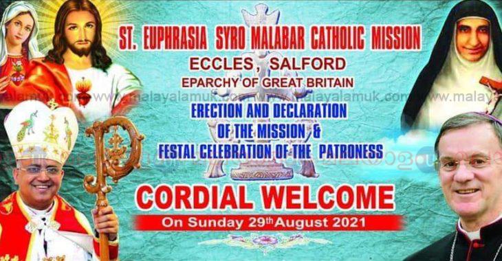 സാൽഫോഡ്, ട്രാഫോഡ്, നോർത്ത് മാഞ്ചസ്റ്റർ, വാറിങ്ടൻ എന്നിവിടങ്ങളിലെ സീറോ മലബാർ വിശ്വാസികൾക്കു വേണ്ടി സ്ഥാപിതമായിരിക്കുന്ന വി. എവുപ്രാസ്യ മിഷന്റെ ഉദ്ഘാടനവും തിരുനാളും സംയുക്തമായി ആഗസ്റ്റ് 29 ഞായർ 2:15 ന് സെന്റ് മേരീസ് ചർച്ച് എക്കിൾസിൽ നടക്കും (M30 0LU). ഈ സ്ഥലങ്ങളിലെ സീറോ മലബാർ വിശ്വാസികളുടെ ചിരകാല ആഗ്രഹമാണ് ഇവിടെ പൂവണിയുന്നത്. ഗ്രേറ്റ് ബ്രിട്ടൻ സീറോ മലബാർ ബിഷപ്പ് മാർ ജോസഫ് സ്രാമ്പിക്കൽ പിതാവിന്റെ മുഖ്യ കാർമ്മികത്വത്തിൽ നടക്കുന്ന തിരുക്കർമ്മങ്ങളിൽ സാൽഫോഡ് രൂപതാദ്ധ്യക്ഷൻ ബിഷപ്പ് മാർ ജോൺ അർനോൾഡ് പിതാവിന്റെ സാന്നിദ്ധ്യം ഉണ്ടാകും. വികാരി ജനറാൾമാരായ മോൺ. ആന്റണി ചുണ്ടെലിക്കാട്ട്, മോൺ. ജിനോ അരീക്കാട്ട്, മോൺ. സജി മലയിൽ പുത്തൻപുര, മാഞ്ചസ്റ്റർ റീജ്യണൽ കോഡിനേറ്റർ റവ. ഫാ. ജോസ് അഞ്ചാനിക്കൽ, റവ. ഫാ. ജോ മൂലച്ചേരി എന്നിവർ സഹകാർമ്മികരായിരിക്കും.