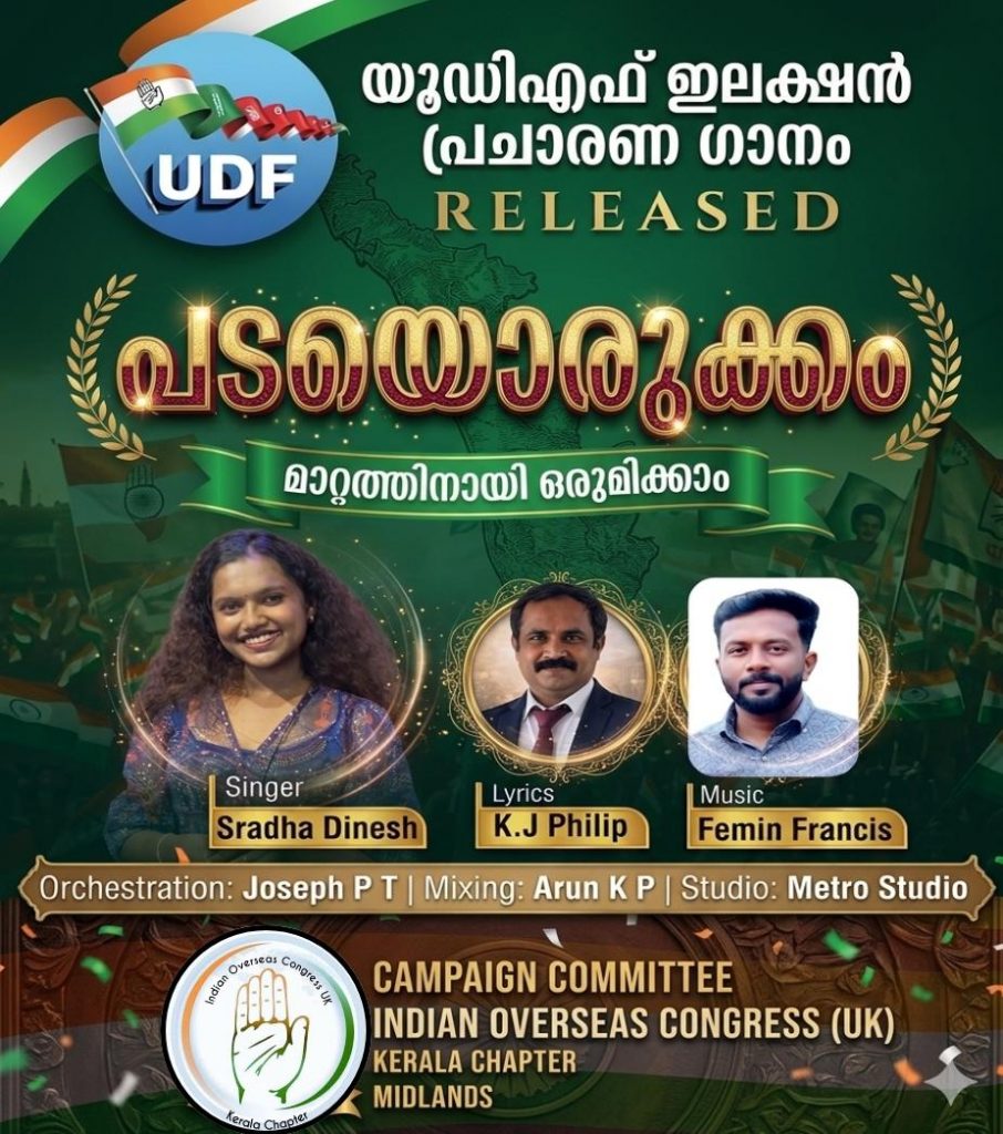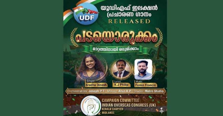 മിഡ്ലാന്ഡ്സ്: കേരള നിയമസഭ തെരഞ്ഞെടുപ്പിനെ മുന്നിൽക്കണ്ട് യു ഡി എഫ് സ്ഥാനാർഥികളുടെ വിജയത്തിനായി ഇന്ത്യൻ ഓവർസീസ് കോൺഗ്രസ് (യുകെ) കേരള ചാപ്റ്റർ മിഡ്ലാന്ഡ്സ് ക്യാമ്പയിൻ കമ്മിറ്റി തയ്യാറാക്കിയ പ്രചാരണ വീഡിയോ ഗാനം പുറത്തിറങ്ങി. “പടയൊരുക്കം – മാറ്റത്തിനായി ഒരുമിക്കാം” എന്ന ആശയവുമായി പുറത്തിറങ്ങിയ ഈ ഗാനം സോഷ്യൽ മീഡിയ പ്ലാറ്റ്ഫോമുകളിൽ ഇതിനോടകം ശ്രദ്ധ നേടിക്കഴിഞ്ഞു.