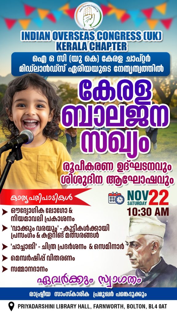 ബോൾട്ടൻ: ഇന്ത്യൻ ഓവർസീസ് കോൺഗ്രസ് (യു കെ) – കേരള ചാപ്റ്റർ മിഡ്ലാൻഡ്സ് ഏരിയ യൂണിറ്റ് / റീജിയനുകളുടെ നേതൃത്വത്തിൽ 6 മുതൽ 15 വയസ്സുവരെയുള്ള കുട്ടികൾക്കായി ‘ജവഹർ ബാൽ മഞ്ച്’ മാതൃകയിൽ ‘കേരള ബാലജന സഖ്യം’ എന്ന പേരിൽ കൂട്ടായ്മ രൂപീകരിക്കുന്നു.