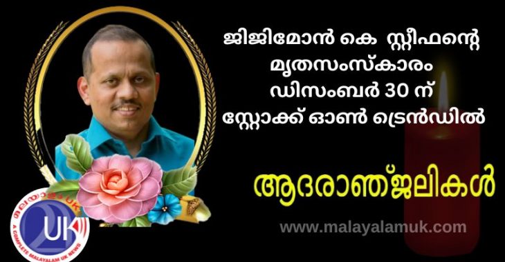 സ്റ്റോക്ക് ഓൺ ട്രെൻഡിൽ നിര്യാതനായ ജിജിമോൻ കെ. സ്റ്റീഫൻ (ജിജി) ൻ്റെ ശുശ്രൂഷകൾ , 2025 ഡിസംബർ 30 ചൊവ്വാഴ്ച രാവിലെ 8.00 ന് ഇംഗ്ലണ്ടിലെ സ്റ്റോക്ക്-ഓൺ-ട്രെന്റിലെ ബഴ്‌സ്ലം ഹാൾ സ്ട്രീറ്റിലുള്ള സെന്റ് ജോസഫ്സ് ആർ.സി. ചർച്ചിൽ (ST6 4BB) നടക്കും. തുടർന്ന് ഉച്ചയ്ക്ക് 12.30 ന് സ്റ്റോക്ക് (ഹാർട്ട്ഷിൽ) സെമിത്തേരിയിൽ മൃതസംസ്കാരം നടത്തും.