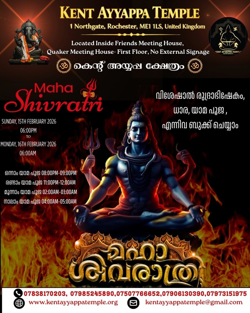 ശിവരാത്രീ പൂജകൾക്ക് ഒരുങ്ങി ഇംഗ്ലണ്ടിലെ കെന്റ് അയ്യപ്പ ക്ഷേത്രം. 2026 ഫെബ്രുവരി 15-ാം തീയതി ഞായറാഴ്ച ദിവസം വൈകുന്നേരം 8 മുതൽ വിശേഷാൽ ശിവപൂജ,ദിപാരാധന ,രുദ്രാഭിഷേകം, യാമപൂജ,ധാര, സഹസ്രനാമ അർച്ചന, ഭജൻസ്, എന്നിവ നടത്തപ്പെടുന്നതാണ്. ഫെബ്രുവരി 16-ാം തീയതി തിങ്കളാഴ്ച പുലർച്ചെ 4 മുതൽ 5 വരെ നടക്കുന്ന യാമപൂജയും ഭസ്മാഭിഷേകത്തോടും കൂടി ശിവരാത്രി പൂജകൾക്ക് പരിസമാപ്ത്തിയാകും .