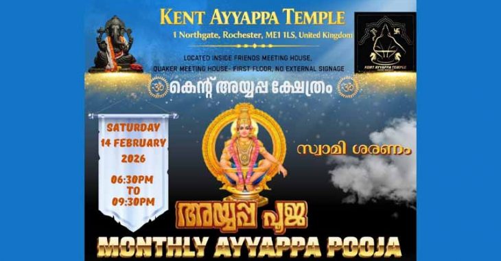 ഇംഗ്ലണ്ടിലെ കെന്റ് അയ്യപ്പ ക്ഷേത്രത്തിൽ കുംഭ മാസ പൂജ (2026 ഫെബ്രുവരി 14 ആം തീയതി ശനിയാഴ്ച) നടക്കും. അന്നേ ദിവസം രാവിലെ 8:30 ന് ഗണപതി ഹോമം, വൈകുന്നേരം 6 മുതൽ അഭിഷേകം, ദീപാരാധന, വിളക്ക് പൂജ, ലളിത സഹസ്ര നാമ അർച്ചന, ഭജന, നീരാഞ്ജനം, പടിപൂജ, ഹരിവരാസനം എന്നിവ നടത്തപ്പെടുന്നതാണ്, വിളക്ക് പൂജയിൽ പങ്കെടുക്കുന്ന ഭക്തർ രണ്ടു ബഞ്ച് പൂക്കളും, ഒരു നിലവിളക്കും, നീരാഞ്ചനത്തിന് ഒരു നാളികേരവും കൊണ്ട് വരേണ്ടതാണ്.ക്ഷേത്രം മേൽശാന്തി ശ്രീ അഭിജിത്ത് തിരുമേനിയും, താഴൂർ മന ശ്രീ ഹരിനാരായണൻ നമ്പിടിശ്വരറും,പൂജകൾക്ക് കാർമികത്വം വഹിക്കും, വെള്ളിയോട്ടില്ലം ശ്രീ അദ്രിത് വാസുദേവ് പൂജകൾക്ക് സഹ കർമികത്വം വഹിക്കും