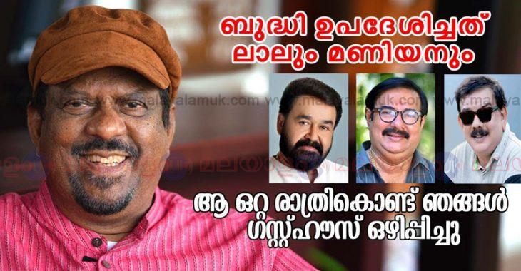 ഞാനും രാജുവും കോടി നേരെ മേക്കപ്പ് റൂമിലേക്ക് പോയി, ഷൂട്ടിങ്ങ് ആവശ്യത്തിനായി അവിടെ ഉണ്ടായിരുന്ന വെളിച്ചപ്പാടിന്റെ വാള് ഞാന് കൈയില് എടുത്തു, രാജു എന്റെ മുഖത്തും ദേഹത്തും കുങ്കുമം പൂശി. ചോരയെന്ന് തോന്നിപ്പിക്കാന് തലയിലൂടെ വെള്ളമൊഴിച്ചു കുഞ്ചന് പറഞ്ഞു. പിന്നെയായിരുന്നു ആ രസകരമായ സംഭവം നടക്കുന്നത്. ഒരു പ്രിയദര്ശന് സിനിമ പോലെ തന്നെയായിരുന്നു അത്. ‘ആ വാളും പിടിച്ച് അലറിക്കൊണ്ട് ഗസ്റ്റ് ഹൗസ്സിന്റെ ഇടനാഴിയിലൂടെ ഞാന് ഓടി, എന്റെ പുറകെ രാജുവും ലാലും പ്രിയനും ഓടിവന്നു. എന്റെ അലറക്കവും ഒപ്പം മറ്റുള്ളവരുടെ ബഹളവും കൂടിയായപ്പോള് എനിക്ക് ബാധ ഇളകിയതാണെന്ന് കരുതി ചെക്കിന് ചെയ്യാൻ നിന്ന ആളുകള് പേടിച്ചു. ആ പേടി ഇരട്ടിപ്പിക്കാന് ലാലും മണിയനും പ്രിയനും ചേര്ന്നു പറഞ്ഞു മാറിക്കോ ഇല്ലെങ്കില് വെട്ട് കൊള്ളും’എന്ന്.