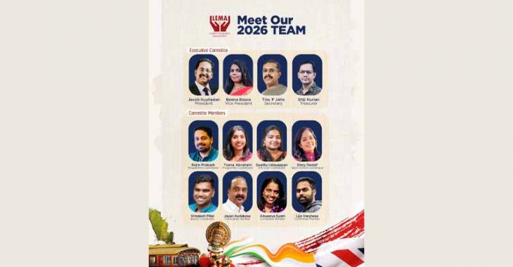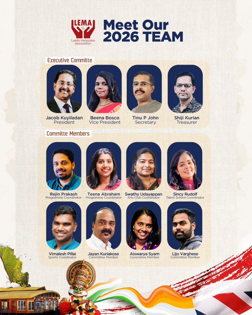 ലീഡ്സ്: ലീഡ്സ് മലയാളി അസോസിയേഷൻ്റെ (LEMA) 2026-2027 ലേക്കുള്ള പുതിയ പ്രവർത്തന സമിതിയെ തിരഞ്ഞെടുത്തു. ജനുവരി 10-ന് നടന്ന അസോസിയേഷൻ്റെ ക്രിസ്തുമസ് – പുതുവത്സര ആഘോഷങ്ങളോടനുബന്ധിച്ച് കൂടിയ പ്രധാന പൊതുയോഗത്തിലാണ് പുതിയ ടീമിനെ ഔദ്യോഗികമായി പ്രഖ്യാപിച്ചത്.