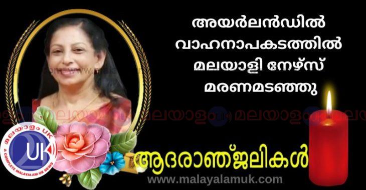 അയർലൻഡിൽ മലയാളി നേഴ്സിന് വാഹനാപകടത്തിൽ ദാരുണാന്ത്യം. കൂത്താട്ടുകുളം പാലക്കുഴ സ്വദേശിയായ ലിസി സാജു (59) ആണ് മരണമടഞ്ഞത്. ലിസി റോസ്കോമൺ യൂണിവേഴ്സിറ്റി ഹോസ്പിറ്റലിൽ നേഴ്സ് ആയി ജോലിചെയ്തുവരികയായിരുന്നു.