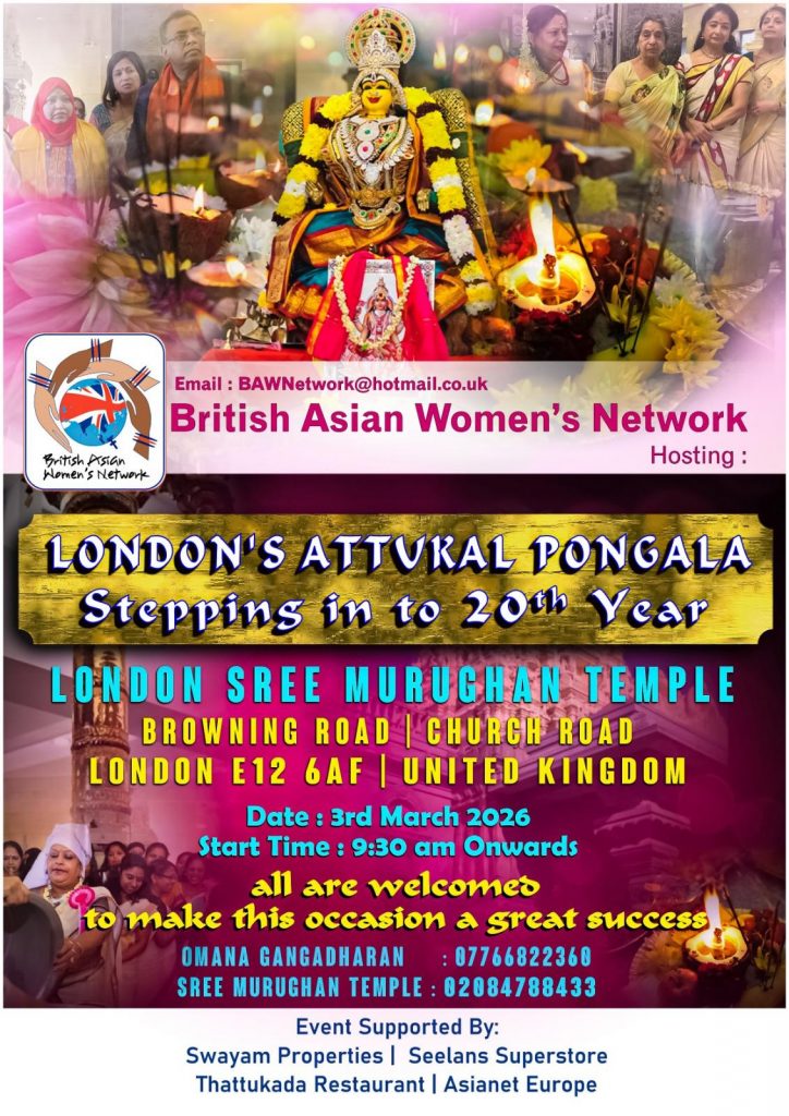 ഏവരെയും സ്നേഹപൂർവ്വം ലണ്ടൻ ശ്രീ മുരുകൻ ക്ഷേത്ര ആറ്റുകാൽ പൊങ്കാലയിലേക്ക് ക്ഷണിച്ചു കൊള്ളുന്നതായി സംഘാടകർ അറിയിച്ചു. കൂടുതൽ വിവരങ്ങൾക്ക്: 020 8478 8433
