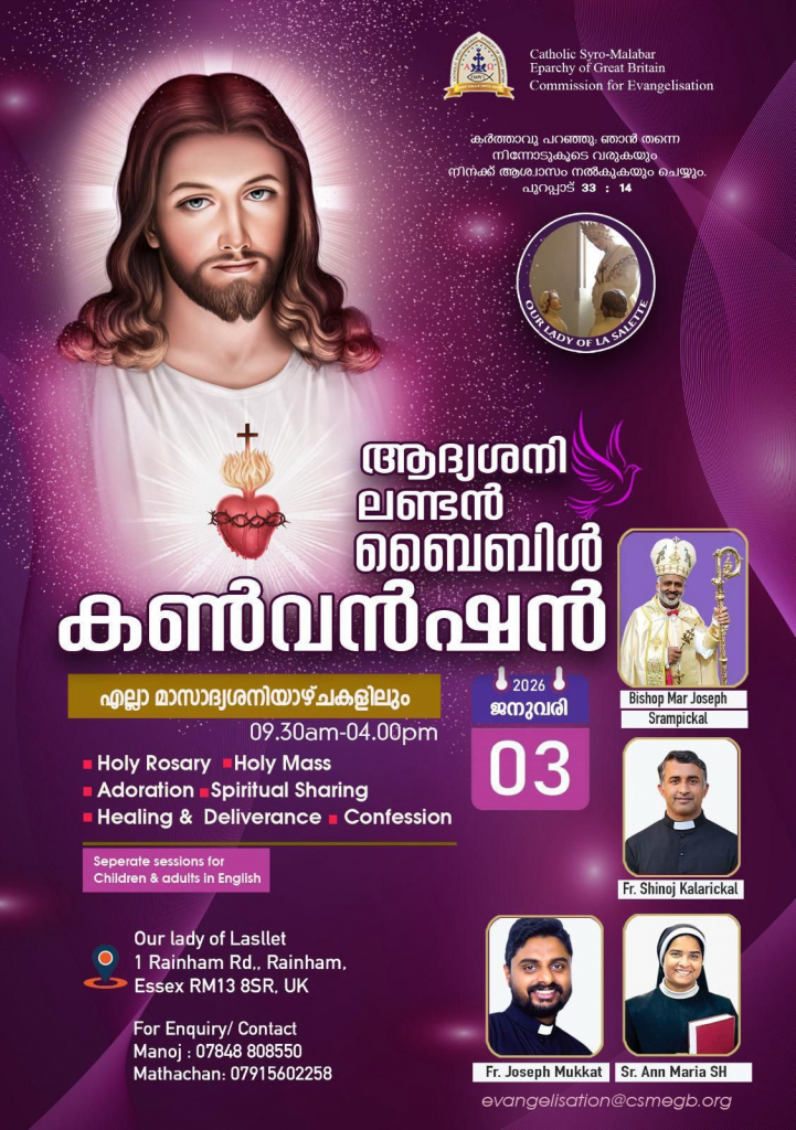 ലണ്ടനിൽ നടത്തപ്പെടുന്ന ആദ്യ ശനിയാഴ്ച്ച ബൈബിൾ കൺവെൻഷൻ തിരുക്കർമ്മങ്ങളിലും ശുശ്രുഷകളിലും പങ്കുചേർന്ന് ആത്മീയ നവീകരണവും, സൗഖ്യ ശാന്തിയും, കൃപകളും, വിടുതലും മാതൃ മദ്ദ്യസ്ഥതയിൽ പ്രാപിക്കുവാൻ ഏവരെയും സ്നേഹപൂർവ്വം കൺവെൻഷനിലേക്ക് സ്വാഗതം ചെയ്യുന്നു.