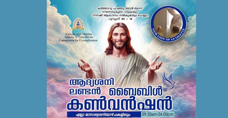 റയിൻഹാം: ഗ്രേറ്റ് ബ്രിട്ടൻ സീറോമലബാർ എപ്പാർക്കി ഇവാഞ്ചലൈസേഷൻ കമ്മീഷന്റെ നേതൃത്വത്തിൽ, ലണ്ടനിൽ വെച്ച് മാസം തോറും സംഘടിപ്പിക്കുന്ന ‘ആദ്യ ശനിയാഴ്ച്ച ബൈബിൾ കൺവെൻഷൻ’ നവംബർ 1 ന് ശനിയാഴ്ച ഉണ്ടായിരിക്കുന്നതാണ്. ലണ്ടനിൽ റയിൻഹാം ഔർ ലേഡി ഓഫ് ലാസലേറ്റ് കത്തോലിക്കാ ദേവാലയത്തിലാണ് കൺവെൻഷൻ ക്രമീകരിച്ചിരിക്കുന്നത്.