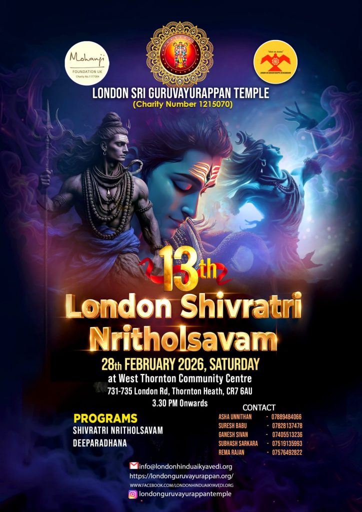 ലണ്ടനിൽ ഒരു ഗുരുവായൂരപ്പ ക്ഷേത്രം എന്ന സാക്ഷാത്കാരത്തിമായി പ്രവർത്തിക്കുന്ന, മോഹൻജി ഫൗണ്ടേഷനും, ലണ്ടൻ ശ്രീ ഗുരുവായൂരപ്പ സേവാ സംഘവും ചേർന്ന് 13 ആമത് ലണ്ടൻ ശിവരാത്രി നൃത്തോത്സവം സംഘടിപ്പിക്കുന്നു. 2026 ഫെബ്രുവരി 28 ആം തീയതി ശനിയാഴ്ച 3:30 pm മുതൽ തോണ്ടൻ ഹീത്തിലുള്ള വെസ്റ്റ് തോണ്ടൻ കമ്മ്യൂണിറ്റി സെന്ററിൽ വച്ചാണ് ശിവരാത്രി നൃത്തോത്സവ ചടങ്ങുകൾ സഘടിപ്പിച്ചിരിക്കുന്നത്. മന്ത്ര അക്കാദമി ഓഫ് പെർഫോമിംഗ് ആർട്സിന്റെ സ്ഥാപകയും കലാനിർദ്ദേശികയും, അഞ്ചാം വയസ്സിൽ നൃത്തം ആരംഭിച്ച് കലാമണ്ഡലം സത്യഭാമയുടെ മാർഗനിർദേശത്തിൽ ഭാരതനാട്യം, മോഹിനിയാട്ടം, കുച്ചിപ്പുടി എന്നീ നൃത്തശൈലികൾ അഭ്യസിച്ചിട്ടുള്ള തും, പത്ത് വർഷത്തിലധികമായി നൃത്തം കോറിയോഗ്രാഫ് ചെയ്യുകയും അധ്യാപനം നടത്തുകയും ചെയ്യുന്ന ശ്രീമതി ആശ ഉണ്ണിത്താൻ ശിവരാത്രി നൃത്തോത്സവത്തിന് നേതൃത്വം നൽകും. നൃത്തോത്സവത്തിന് ശേഷം ദീപാരാധനയോടുകൂടി ലണ്ടൻ ശിവരാത്രി നൃതോത്സവത്തിന് പരിസമാപ്തി ആകും. ഉണ്ടായിരിക്കുന്നതാണ്.