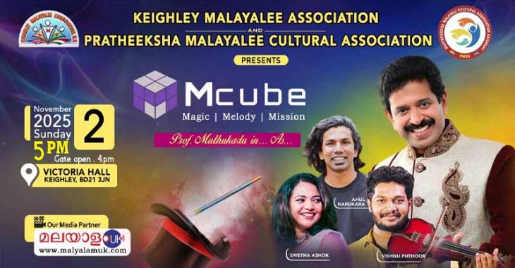 കീത്തിലി മലയാളി അസ്സോസിയേഷനും പ്രതീക്ഷ കൾച്ചറൽ മലയാളി അസ്സോസിയേഷനും ഒരുമിച്ച് അണിയിച്ചൊരുക്കുന്ന എം ക്യൂബ് മാജിക് നൈറ്റ് ഷോ നവംബർ 2 ന് കീത്തിലി വിക്ടോറിയാ ഹാളിൽ അരങ്ങേറും. മെഗാ ഷോയുടെ ടിക്കറ്റ് വിൽപ്പന പൂർത്തിയായി. ഞായറാഴ്ച്ച വൈകുന്നേരം കൃത്യം 5 മണിയ്ക്ക് മെഗാ ഷോ ആരംഭിക്കും. 4 മണി മുതൽ വിക്ടോറിയാ ഹാളിൻ്റെ ഗേറ്റ് കാണിക്കൾക്കായി തുറന്നു കൊടുക്കും. 400 സീറ്റുകൾ മാത്രമുള്ള വിക്ടോറിയാ ഹാളിൽ തിരക്കൊഴിവാക്കാൻ കാണികൾ കൃത്യസമയത്തു തന്നെ എത്തിച്ചേരണമെന്ന് സംഘാടകർ അഭ്യർത്ഥിച്ചിട്ടുണ്ട്.