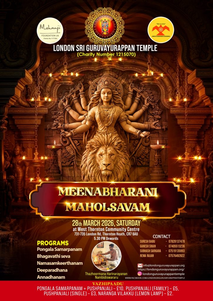 ലണ്ടനിൽ ഒരു ഗുരുവായൂരപ്പ ക്ഷേത്രം എന്ന സാക്ഷാത്കാരത്തിമായി പ്രവർത്തിച്ച് കൊണ്ടിരിക്കുന്ന , മോഹൻജി ഫൗണ്ടേഷനും, ലണ്ടൻ ശ്രീ ഗുരുവായൂരപ്പ സേവാ സംഘവും സംയുക്തമായി മീനഭരണി ആഘോഷം സംഘടിപ്പിക്കുന്നു. 2026 മാർച്ച് 28 ശനിയാഴ്ച വൈകുന്നേരം 5:30 മുതൽ തോണ്ടൻ ഹീത്തിലുള്ള വെസ്റ്റ് തോണ്ടൻ കമ്മ്യൂണിറ്റി സെന്ററിൽ വച്ചാണ് ചടങ്ങുകൾ സഘടിപ്പിച്ചിരിക്കുന്നത്. അന്നേ ദിവസം പൊങ്കാല സമർപ്പണം, ഭഗവതി സേവ,നാമസങ്കീർത്തനം,താലപ്പൊലി, ദീപാരാധന, അന്നദാനം എന്നിവ ഉണ്ടായിരിക്കുന്നതാണ്.പ്രത്യേക വഴിപാടുകളായ പൊങ്കാല സമർപ്പണം,പുഷ്പാഞ്ജലി, നാരങ്ങ വിളക്ക് എന്നിവയും ഭക്തജനങ്ങൾക്ക് സമർപ്പിക്കാവുന്നതാണ് ചടങ്ങുകൾക്ക് താഴൂർ മന ഹരിനാരായണൻ നമ്പിടിശ്വര്വർ കാർമികത്വം വഹിക്കും.
