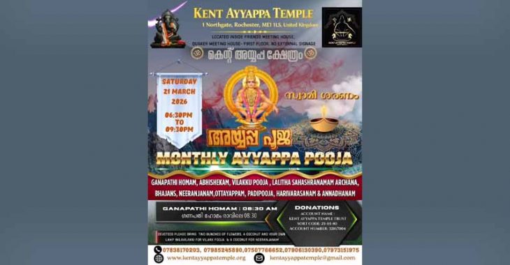 ഇംഗ്ലണ്ടിലെ കെന്റ് അയ്യപ്പ ക്ഷേത്രത്തിൽ മീനമാസ പൂജ 2026 മാർച്ച് 21 ആം തീയതി ശനിയാഴ്ച നടക്കും. അന്നേ ദിവസം രാവിലെ 8:30 ന് ഗണപതി ഹോമം, വൈകുന്നേരം 6 മുതൽ അഭിഷേകം, ദീപാരാധന, വിളക്ക് പൂജ, ലളിത സഹസ്ര നാമ അർച്ചന, ഭജന, നീരാഞ്ജനം, പടിപൂജ, ഹരിവരാസനം എന്നിവ നടത്തപ്പെടുന്നതാണ്. വിളക്ക് പൂജയിൽ പങ്കെടുക്കുന്ന ഭക്തർ രണ്ടു കുല പൂക്കളും, ഒരു നിലവിളക്കും, നീരാഞ്ചനത്തിന് ഒരു നാളികേരവും കൊണ്ട് വരേണ്ടതാണ്. ശ്രീ അഭിജിത്തും താഴുർ മന ശ്രീ ഹരിനാരായണൻ നമ്പിടീശ്വരരും പൂജകൾക്ക് പ്രധാന കാർമികത്വം വഹിക്കും. വെള്ളിയോട്ടില്ലം ശ്രീ അദ്രിത് വാസുദേവ് പൂജകൾക്ക് സഹ കാർമികത്വം വഹിക്കും
