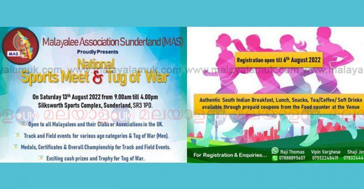 MAS-ന്റെ മറ്റൊരു മെഗാ ഇവൻറായി കായികമേളയും വടം വലി മൽസരവും, 2022 ഓഗസ്റ്റ് 13 ശനിയാഴ്ച, സണ്ടർലാൻഡിലെ സിൽക്സ്വർത്ത് സ്പോർട്സ് കോംപ്ലക്സിൽ രാവിലെ 9.00 മുതൽ വൈകുന്നേരം 4.00 വരെ സംഘടിപ്പിക്കുന്നതായി മാസിൻ്റെ പ്രസിഡൻ്റ് ശ്രീ. റജി തോമസസ് അറിയിച്ചു.