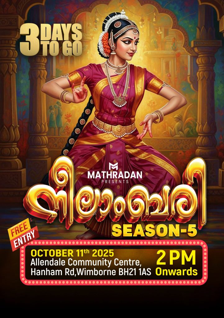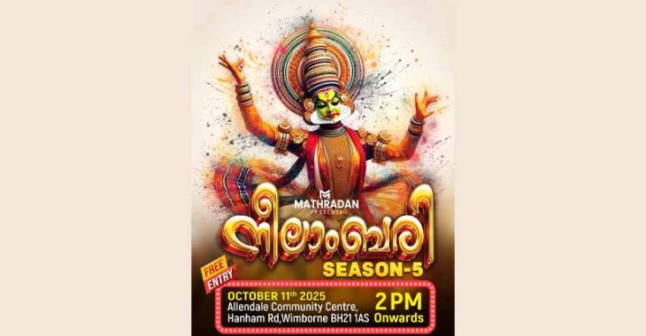 പൂള്: ആലാപന വൈഭവത്തിന്റെയും നൃത്ത ചാരുതയുടെയും വിസ്മയക്കാഴ്ചകളുമായി നീലാംബരി സീസണ് 5 എത്തുകയായ്. വിമ്പോണിലെ അലന്ഡെയ്ല് കമ്മ്യൂണിറ്റി സെന്ററില് ഈ മാസം 11 നാണ് നീലാംബരി അരങ്ങേറുന്നത്. കഴിഞ്ഞ വര്ഷം നീലാംബരിക്കു വേദിയ പൂള് ലൈറ്റ് ഹൗസില് ഇവന്റ് മാനേജ്മെന്റ് നിയന്ത്രണങ്ങളെത്തുടര്ന്ന് പലര്ക്കും പ്രവേശനം ലഭിച്ചിരുന്നില്ല. ഈ സാഹചര്യം ഒഴിവാക്കാനാണ് ഇക്കുറി നീലാംബരി സീസണ് 5 അലന്ഡെയ്ല് കമ്മ്യൂണിറ്റി സെന്ററില് നടത്തുന്നതെന്ന് അധികൃതര് അറിയിച്ചു. വിവിധ ഘട്ടങ്ങളിലായ് നടന്ന സ്ക്രീനിംഗിലൂടെ തെരഞ്ഞെടുക്കപ്പെട്ട നിരവധി ഗായകരാണ് പാട്ടഴകിന്റെ സ്വരലയ വിന്യാസം തീര്ക്കുക. ഇതിനു പുറമേ മെയ് വഴക്കത്തിന്റെ പകര്ന്നാട്ടങ്ങളുമായി പ്രശസ്ത നര്ത്തകരും നീലാംബരി സീസണ് 5ന്റെ മാറ്റു കൂട്ടാനെത്തുന്നു.