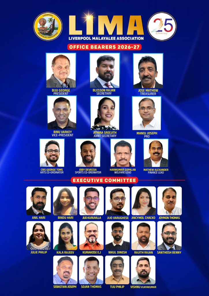 ലിവർപൂൾ: യു കെയിലെ പ്രമുഖ മലയാളി സംഘടനകളിലൊന്നായ ലിവർപൂൾ മലയാളി അസോസിയേഷൻ (ലിമ) 2026 – 2027 പ്രവർത്തന വർഷത്തേക്കുള്ള പുതിയ ഭാരവാഹികളെ തിരഞ്ഞെടുത്തു. ഫെബ്രുവരി 22-ന് ലിവർപൂളിലെ സെയിന്റ് മാർഗരറ്റ് മേരി ചർച്ച് ഓഡിറ്റോറിയത്തിൽ വച്ച് നടന്ന പൊതുയോഗത്തിൽ ഐകകണ്ഠേനയാണ് പുതിയ നേതൃത്വത്തെ തിരഞ്ഞെടുത്തത്.