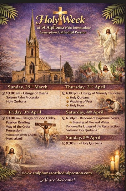 പ്രെസ്റ്റൻ സെന്റ് അൽഫോൻസാ കത്തീഡ്രൽ ദേവാലയത്തിൽ നടക്കുന്ന തിരുക്കർമ്മങ്ങൾക്ക് രൂപതാധ്യക്ഷൻ മാർ ജോസഫ് സ്രാമ്പിക്കൽ കാർമികത്വം വഹിക്കും . ഓശാന ഞാറായ്ച്ചയായ ഇന്ന് രാവിലെ പത്ത് മണിക്കാണ് തിരുക്കർമ്മങ്ങൾ ആരംഭിക്കുന്നത്. പീഡാനുഭവ വെള്ളിയുടെ തിരുക്കർമ്മങ്ങൾ രാവിലെ പത്ത് മാണിക്കും പെസഹാ വ്യാഴാഴ്ച വൈകുന്നേരം ആറ് മണിക്കും . ഉയിർപ്പു തിരുന്നാൾ കർമ്മങ്ങൾ ശനിയാഴ്ച വൈകുന്നേരം ആറരക്കും നടക്കും . ഈസ്റ്റർ ദിനമായ ഞായാറാഴ്ച രാവിലെ ഒന്പതരക്കും വിശുദ്ധ കുർബാന ഉണ്ടായിരിക്കുമെന്ന് കത്തീഡ്രൽ വികാരി റെവ ഡോ വർഗീസ് താനമാവുങ്കൽ അറിയിച്ചു .