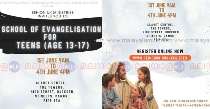 ടീനേജ് പ്രായക്കാരായ കുട്ടികൾക്കായി സെഹിയോൻ യുകെ മിനിസ്ട്രിയുടെ നേതൃത്വത്തിൽ ജൂൺ 1മുതൽ 4വരെ കേംബ്രിഡ്ജിനടുത്തുള്ള ഹണ്ടിങ്ടണിൽ നാല് ദിവസത്തെ താമസിച്ചുള്ള ധ്യാനം നടക്കുന്നു .