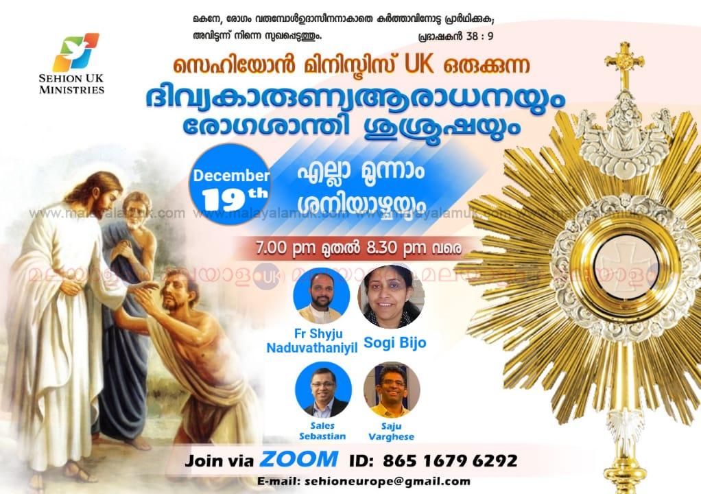 എല്ലാ മാസവും ആദ്യ ശനിയാഴ്ചകളില് നടക്കുന്ന മലയാളം കുര്ബാനയു നൊവേനയും ഈ മാസം ഉണ്ടായിരിക്കുന്നതല്ല. എല്ലാവരും കുടുംബ സമേതം ഏകദിന ധ്യാനത്തിലും ആരാധനയിലും പങ്കുകൊള്ളാല് എത്തിച്ചേരണമെന്ന് അഭ്യര്ത്ഥിക്കുന്നു.