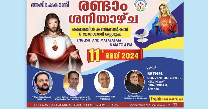 മാഞ്ചസ്റ്റര്‍: ഗ്രേറ്റ് ബ്രിട്ടണ്‍ രൂപത മാഞ്ചസ്റ്റര്‍ റീജിയണ്‍ ബൈബിള്‍ കണ്‍വെന്‍ഷനായുള്ള ഒരുക്കങ്ങള്‍ പൂര്‍ത്തിയായി. ലോക സുവിശേഷവത്ക്കരണം മലയാളികളിലൂടെ എന്ന അലിഖിത വചനത്തെ അന്വര്‍ത്ഥമാക്കിക്കൊണ്ട് സീറോ മലബാര്‍ സഭയ്ക്ക് പ്രത്യേക ദൈവിക പദ്ധതിയുടെ ഭാഗമായി ഗ്രേറ്റ് ബ്രിട്ടണില്‍ സ്ഥാപിതമായ രൂപതയുടെ രണ്ടാമത് ബൈബിള്‍ കണ്‍വെന്‍ഷനായി മാഞ്ചസ്റ്ററില്‍ വന്‍ ഒരുക്കങ്ങളാണ് നടക്കുന്നത്. ലോക പ്രശസ്ത വചന പ്രഘോഷകനും സെഹിയോന്‍ മിനിസ്ട്രീസ് സ്ഥാപകനും അഭിഷേകാഗ്‌നി മിനിസ്ട്രീസ് ഡയറക്ടറുമായ റവ. ഫാ. സേവ്യര്‍ ഖാന്‍ വട്ടായില്‍ നയിക്കുന്ന കണ്‍വെന്‍ഷന്‍ നാളെ നടക്കും. ബിഷപ്പ് മാര്‍. ജോസഫ് സ്രാമ്പിക്കല്‍ കണ്‍വെന്‍ഷന്‍ ഉദ്ഘാടനം ചെയ്ത് തിരുക്കര്‍മ്മങ്ങള്‍ക്ക് നേതൃത്വം നല്‍കും.