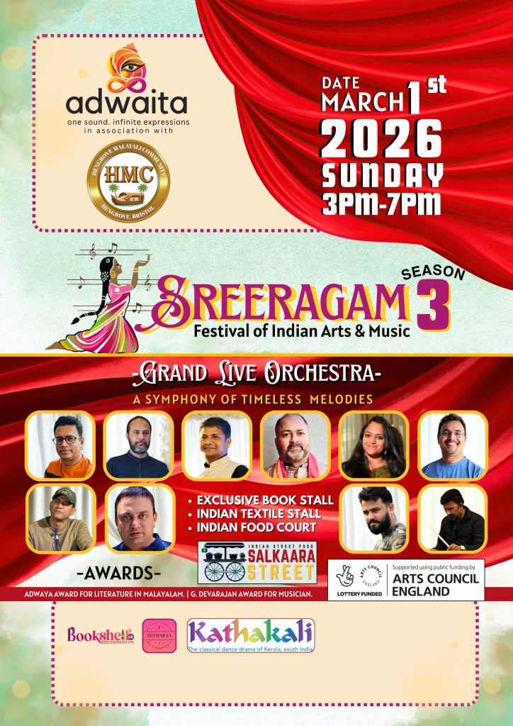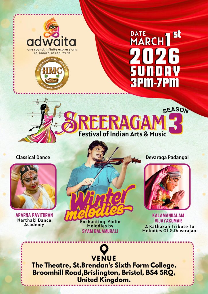 അദ്വൈത ആർട്സും, ഹെൻഗ്രോവ് മലയാളീ കമ്മ്യൂണിറ്റിയും സംയുക്തമായി ഒരുക്കുന്ന ഇന്ത്യൻ കലാ സംഗീതോത്സവം ആയ “ശ്രീരാഗം “സീസൺ 3 ബ്രിസ്റ്റളിൽ മാർച്ച്‌ ഒന്ന് ഞായറാഴ്ച മൂന്നു മണി മുതൽ ഏഴു മണി വരെ നടക്കും.