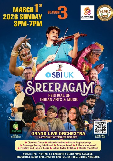 അദ്വൈത ആർട്സ് , ഹെൻ ഗ്രോവ് മലയാളി കമ്മ്യൂണിറ്റിയുടെ(HMC) സഹകരണത്തോടെ അണിയിച്ചൊരുക്കുന്ന,യുകെയിൽ കലയും സാഹിത്യവും സംഗീതവും സംഗമിക്കുന്ന അപൂർവ്വ വേദിയായ ശ്രീരാഗം – സീസൺ 3, ഇന്ത്യൻ കലാസംഗീതോത്സവം മാർച്ച് 1 ഞായറാഴ്ച ഉച്ചയ്ക്ക് 3 മുതൽ വൈകിട്ട് 7 വരെ ബ്രിസ്റ്റളിൽ നടക്കും.