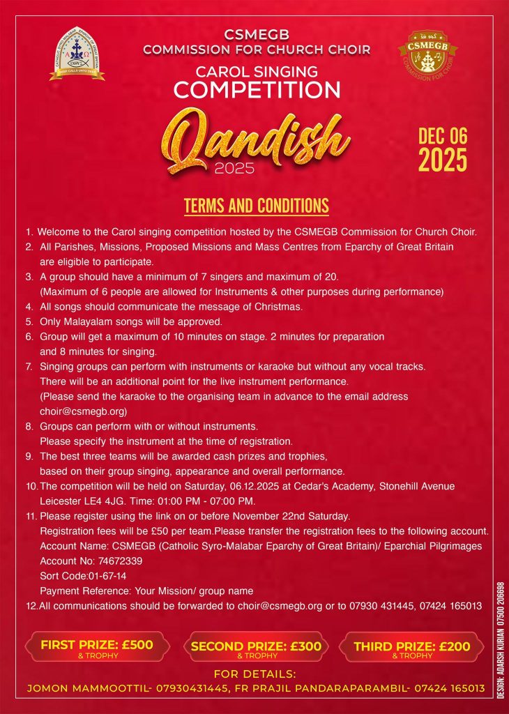 ഗ്രേറ്റ് ബ്രിട്ടൻ സിറോ-മലബാർ രൂപത ഒരുക്കുന്ന *All UK Carol Singing Competition ” 2025″* ഡിസംബർ 6, 2025ന് ലെസ്റ്ററിലെ Cedar’s Academy, Stonehill Avenue ൽ നടക്കും. ഉച്ചക്ക് 1 മണി മുതൽ ആരംഭിക്കുന്ന ഈ മത്സരത്തിൽ രൂപതയിലെ എല്ലാ ഇടവകളിലെ, മിഷനുകളിലെ, പ്രൊപോസ്ഡ് മിഷനുകളിലെ, മാസ്സ് സെന്ററുകളിലെ കൊയർ ടീമുകൾ പങ്കെടുക്കാം. പങ്കെടുക്കാൻ ആഗ്രഹിക്കുന്ന ടീമുകൾ നവംബർ 22-ന് മുമ്പ് ഗൂഗിൾ ഫോം വഴി രജിസ്റ്റർ ചെയ്യേണ്ടതാണ്.