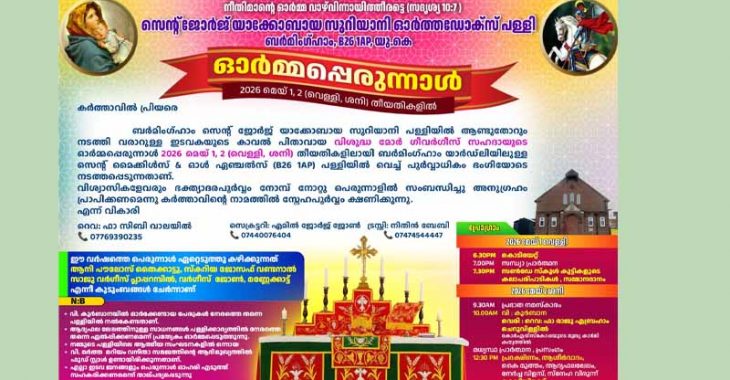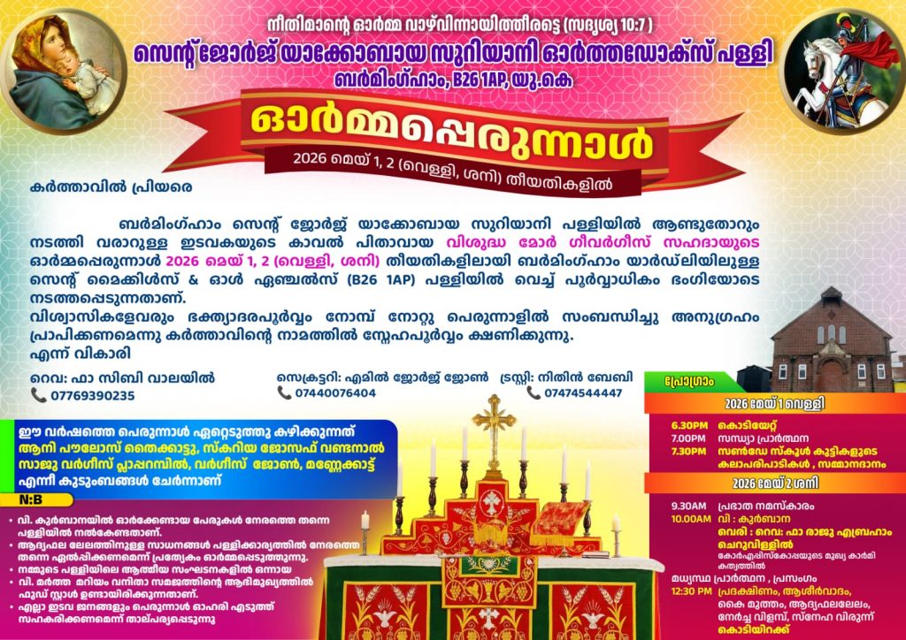 ഇംഗ്ലണ്ടിലെ ആദ്യകാല യാക്കോബായ സുറിയാനി പള്ളികളിൽ ഒന്നായ ബിർമിങ്ഹാം സെന്റ് ജോർജ് യാക്കോബായ സുറിയാനി പള്ളിയിൽ വിശുദ്ധ ഗീവർഗീസ് സഹദായുടെ ഓർമപ്പെരുന്നാൾ ദേവാലയത്തിൽ 2026 മെയ് 1, 2 തീയതികളിൽ ഭക്തി നിർഭരമായി ആഘോഷിക്കുന്നു. മെയ് 1 നു (വെള്ളിയാഴ്ച) 6:00PM നു കൊടിയേറ്റുകയും അന്നേ ദിവസം വൈകുന്നേരം 7.00PM മണിക്കു സന്ധ്യാ പ്രാർത്ഥനയും തുടർന്ന് ഭക്ത സംഘടനകളുടെ സംയുക്ത വാർഷികവും നടത്തപ്പെടും.