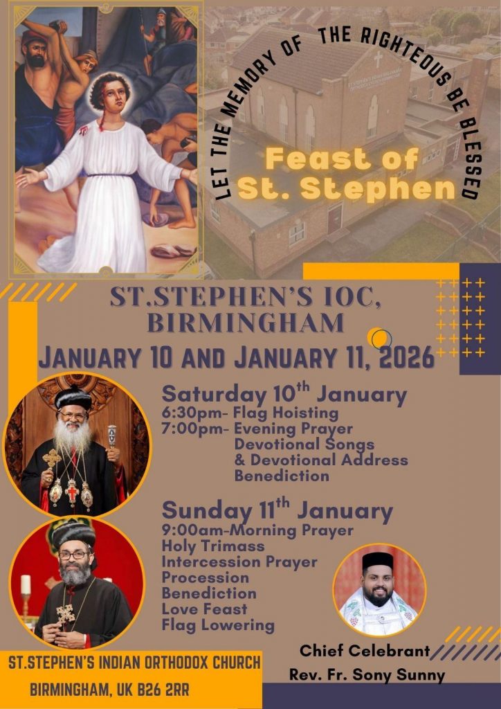 ബിർമിങ്ഹം സെന്റ് സ്റ്റീഫൻസ് ഇടവകയുടെ കാവൽപിതാവും,സഭയിലെ പ്രഥമ രക്തസാക്ഷിയുമായ സ്തെഫനോസ് സഹദായുടെ ഓർമ്മ പെരുന്നാൾ ഭക്തി നിർഭരമായ ചടങ്ങുകളോടെ ആഘോഷിക്കുന്നു. ഫാ:സോണി സണ്ണി പെരുന്നാൾ ചടങ്ങുകൾക്ക് മുഖ്യ കാർമികത്വം വഹിക്കും. ഇടവക വികാരി ഫാ: ബിനോയ് ജോഷുവ സഹകാർമ്മികനാകും.